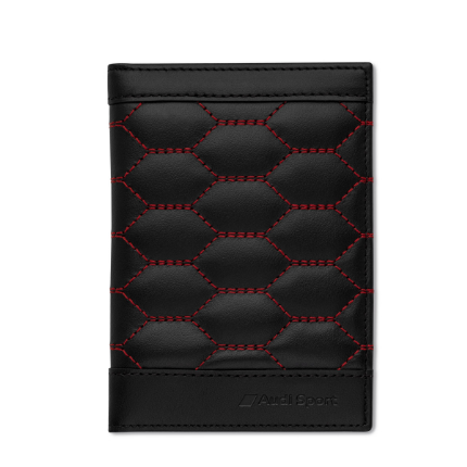 Stylish red Audi Sport vehicle slip cover in portrait format made of Italian cowhide leather with honeycomb quilting. Details: - Three card slots and two large slip pockets - One mesh compartment (approx. 7.5 x 11 cm, suitable for German vehicle licenses) - Embossed Audi Sport logo on the front - RFID blocking - Lining with Audi Sport logo - Made by hand in Europe Dimensions: approx. 8.7 x 12 x 1 cm (closed) Material: cowhide leather; Lining: viscose Colours: Black, Red